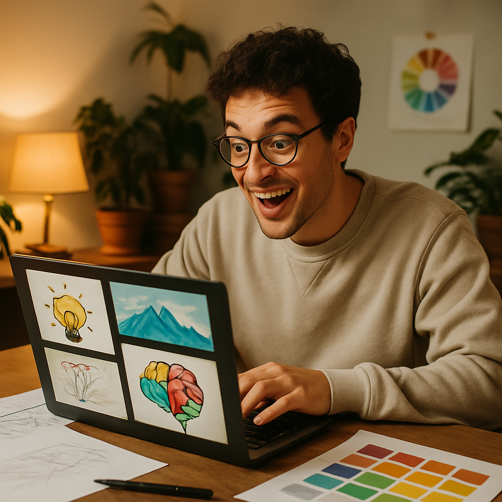 An AI image generator turns a plain-English description into a finished visual — no templates, no drag-and-drop, no clip-art library. You describe the scene you want (a watercolor fox holding balloons, a minimalist winter landscape, a retro birthday cake illustration), and the AI produces it as a high-quality image file you can use immediately.