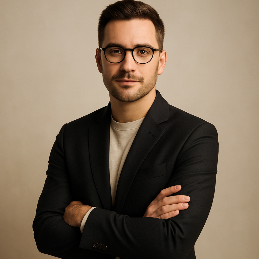 - Expression: Confident, direct eye contact with a slight, natural smile — approachable without being casual.