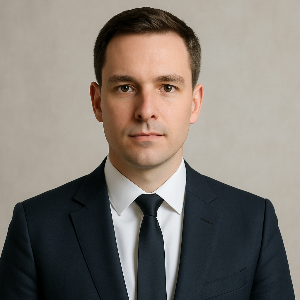 Prompt: Professional headshot of a man in his 40s with short gray hair, wearing a dark charcoal blazer over a light blue collared shirt, plain white background, soft even studio lighting, confident and approachable expression, slight smile, looking directly at the camera, head and shoulders framing.