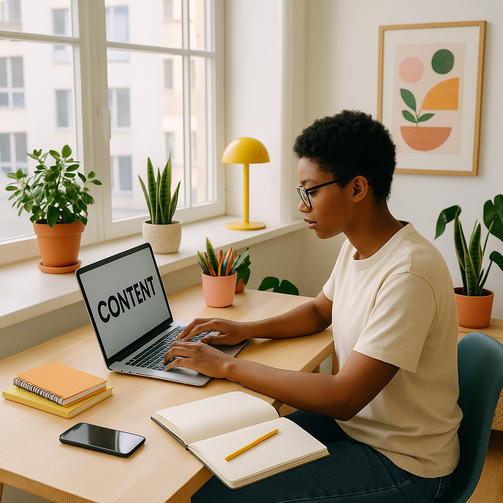 Creator / Content Maker: "Wide 3:1 banner, clean minimal workspace with laptop, notebook, and coffee, natural window light, soft warm tones, top-down angle, no clutter, no text."
