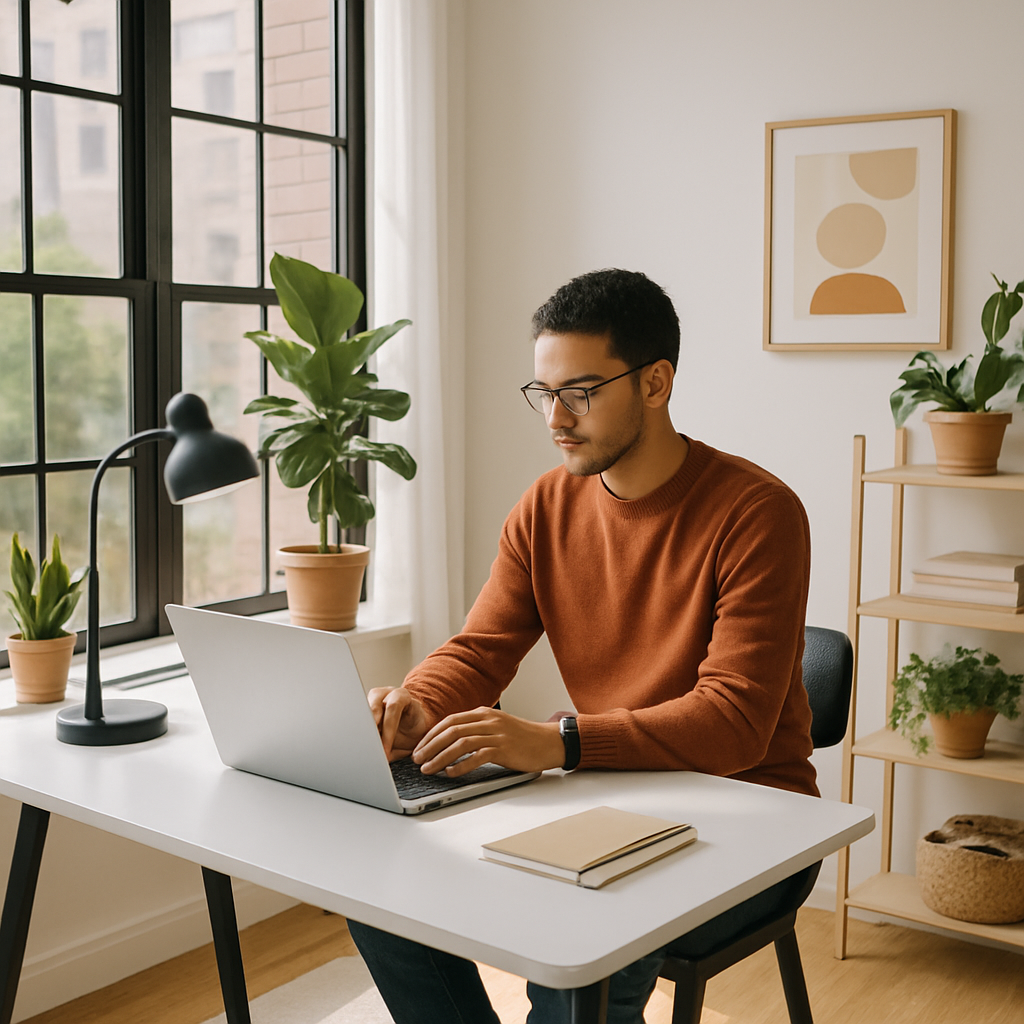 Prompt example — Finance newsletter hero banner: "Wide landscape banner, a minimalist desk with a single open notebook, a pen, and a small succulent plant, soft natural window light, muted beige and sage green tones, editorial flat lay photography"