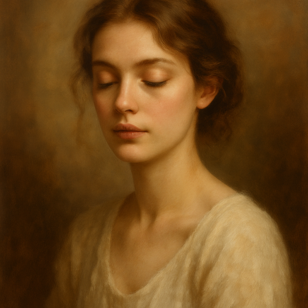 Example prompt: "Oil painting portrait of a woman in her early 40s with curly red hair and warm brown eyes, wearing a cozy knit sweater, sitting by a window with autumn leaves outside, soft natural light, warm color palette, fine art style"