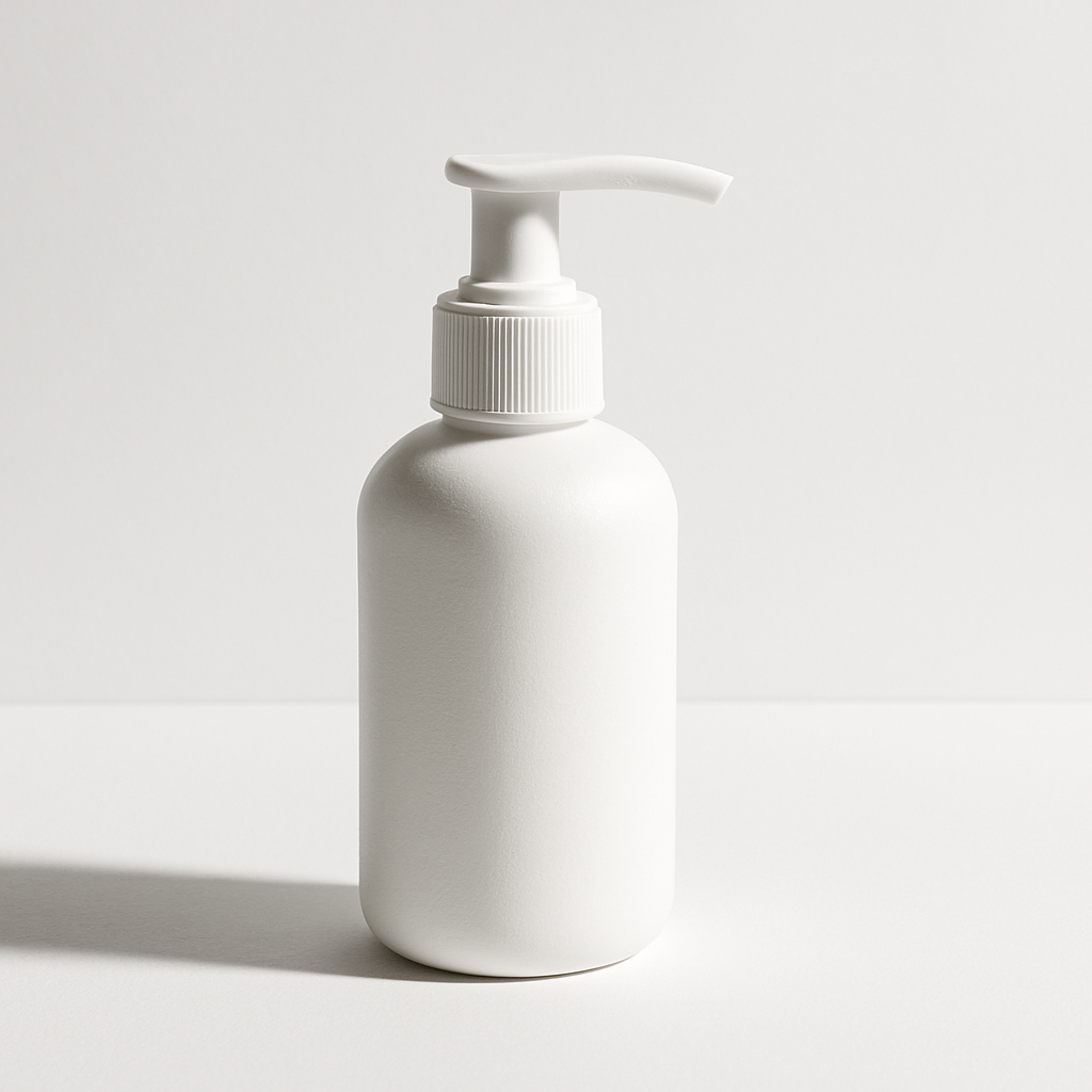 Skincare: "A minimalist white glass serum bottle with a gold dropper cap and a clean sans-serif label reading 'LUMÉ', sitting on a marble surface with soft morning light from the left, close-up product shot"