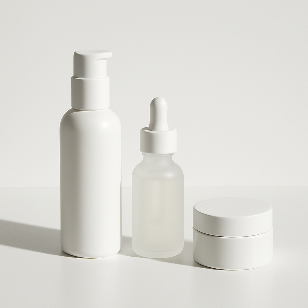 "Matte black skincare serum bottle with a gold dropper cap, placed on a marble surface, surrounded by dried botanicals, soft natural window light from the left, shot from a 45-degree angle, clean and minimal editorial style."