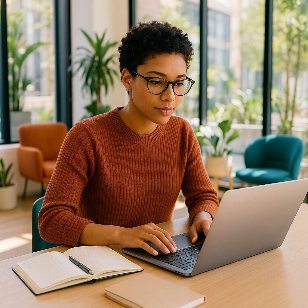 "A confident woman standing in front of a glowing laptop screen displaying code, dark blue and purple gradient background, professional and empowering mood, 16:9 landscape"